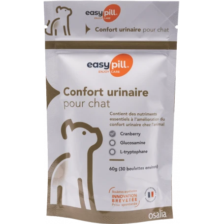 n ","attr":{"id":"","class":""},"moduleName":"totcustomfields"}],"allow_oosp":0,"category":"systeme-urinaire","category_name":"Systu00e8me urinaire","link":"https://www.vetoavenue.fr/78614-easypill-chat-confort-urinaire.html","attribute_price":11.8,"price_tax_exc":11.8,"price_without_reduction":14.16,"reduction":0,"specific_prices":[],"quantity":99,"quantity_all_versions":99,"id_image":"fr-default","features":[{"name":"Groupe Espu00e8ces","value":"Chiens","id_feature":"1","position":"0"},{"name":"Espu00e8ces","value":"Chiens","id_feature":"2","position":"1"},{"name":"Type de produits","value":"Produits vu00e9tu00e9rinaires","id_feature":"3","position":"2"},{"name":"Type de produits","value":"Complu00e9ments nutritionnels","id_feature":"3","position":"2"},{"name":"Objectifs Santu00e9","value":"Pru00e9vention ru00e9nale","id_feature":"6","position":"5"},{"name":"Objectifs Santu00e9","value":"Pru00e9vention urinaire","id_feature":"6","position":"5"}],"attachments":[],"virtual":0,"pack":0,"packItems":[],"nopackprice":0,"customization_required":false,"attributes":{"5":{"id_attribute":"14851","id_attribute_group":"5","name":"Bou00eete de 30 boulettes de 2 g","group":"Pru00e9sentation","reference":"3760302730001","ean13":"3760302730001","isbn":"","upc":"376030273000","mpn":""}},"rate":20,"tax_name":"TVA FR 20%","ecotax_rate":0,"unit_price":"","customizations":{"fields":[]},"id_customization":0,"is_customizable":false,"show_quantities":true,"quantity_label":"Produits","quantity_discounts":[],"customer_group_discount":0,"images":[{"bySize":{"cart_default":{"url":"https://www.vetoavenue.fr/158594-cart_default/easypill-chat-confort-urinaire.jpg","width":90,"height":90},"small_default":{"url":"https://www.vetoavenue.fr/158594-small_default/easypill-chat-confort-urinaire.jpg","width":90,"height":90},"home_default":{"url":"https://www.vetoavenue.fr/158594-home_default/easypill-chat-confort-urinaire.jpg","width":278,"height":278},"medium_default":{"url":"https://www.vetoavenue.fr/158594-medium_default/easypill-chat-confort-urinaire.jpg","width":455,"height":455},"large_default":{"url":"https://www.vetoavenue.fr/158594-large_default/easypill-chat-confort-urinaire.jpg","width":800,"height":800}},"small":{"url":"https://www.vetoavenue.fr/158594-cart_default/easypill-chat-confort-urinaire.jpg","width":90,"height":90},"medium":{"url":"https://www.vetoavenue.fr/158594-home_default/easypill-chat-confort-urinaire.jpg","width":278,"height":278},"large":{"url":"https://www.vetoavenue.fr/158594-large_default/easypill-chat-confort-urinaire.jpg","width":800,"height":800},"legend":"","id_image":"158594","cover":"1","position":"1","associatedVariants":["144425"]}],"cover":{"bySize":{"cart_default":{"url":"https://www.vetoavenue.fr/158594-cart_default/easypill-chat-confort-urinaire.jpg","width":90,"height":90},"small_default":{"url":"https://www.vetoavenue.fr/158594-small_default/easypill-chat-confort-urinaire.jpg","width":90,"height":90},"home_default":{"url":"https://www.vetoavenue.fr/158594-home_default/easypill-chat-confort-urinaire.jpg","width":278,"height":278},"medium_default":{"url":"https://www.vetoavenue.fr/158594-medium_default/easypill-chat-confort-urinaire.jpg","width":455,"height":455},"large_default":{"url":"https://www.vetoavenue.fr/158594-large_default/easypill-chat-confort-urinaire.jpg","width":800,"height":800}},"small":{"url":"https://www.vetoavenue.fr/158594-cart_default/easypill-chat-confort-urinaire.jpg","width":90,"height":90},"medium":{"url":"https://www.vetoavenue.fr/158594-home_default/easypill-chat-confort-urinaire.jpg","width":278,"height":278},"large":{"url":"https://www.vetoavenue.fr/158594-large_default/easypill-chat-confort-urinaire.jpg","width":800,"height":800},"legend":"","id_image":"158594","cover":"1","position":"1","associatedVariants":["144425"]},"has_discount":false,"discount_type":null,"discount_percentage":null,"discount_percentage_absolute":null,"discount_amount":null,"discount_amount_to_display":null,"price_amount":14.16,"unit_price_full":"","show_availability":true,"availability_date":null,"availability_message":"Livraison entre 48h et 72h (hors Corse) ouvru00e9s chez votre vu00e9tu00e9rinaire","availability":"available"} »>