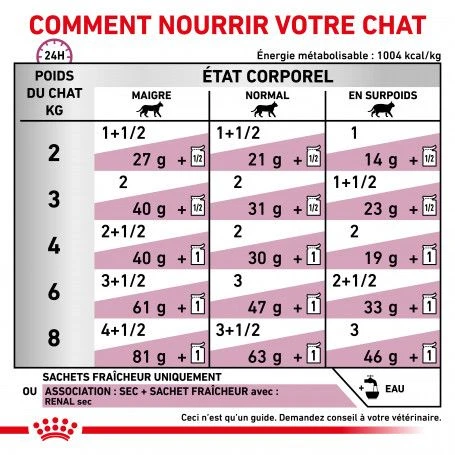 Les sachets repasu00a0Veterinary Health Nutrition Cat Renal Boeufu00a0 sont destinu00e9s u00e0 la prise en charge nutritionnelle du2019une maladie du chat. Veuillez consulter votre vu00e9tu00e9rinaire avant utilisation.